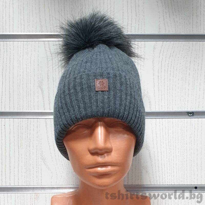 Зимна топла дамска шапка SilverStar в тъмносив цвят с пух/помпон