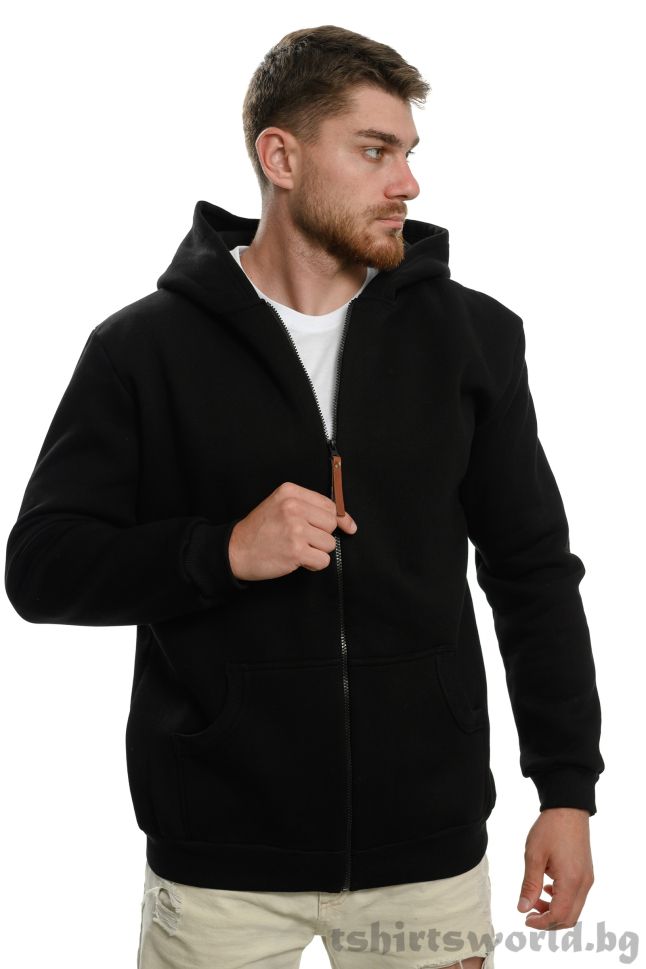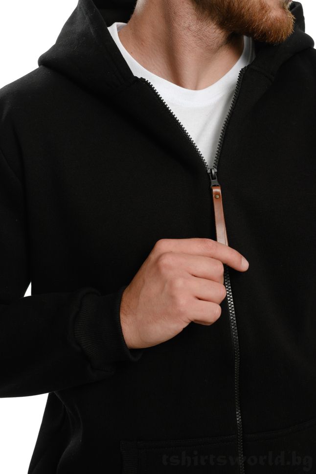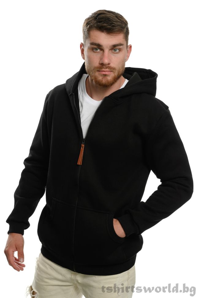 Мъжки суитшърт в черен цвят с цип, качулка, две джобчета и трансферен печат логото на Харли Дейвидсън (Harley Davidson), Мотори. Произведен под марката MALFINI от 65% памук и 35% полиестер на 300g/m², което го прави изключително топъл и желан от нашите дългогодишни клиенти. Уникален модел с качулка с подплата и връзки за стягане, а вътрешната част на бието на деколтето е обшита с контрасна лента. Моделът е подходящ за пролетния и есенно-зимният сезон, има ластични маншети на китките и ханша, запазващи топлината. Разполага с мека подплата и два отворени джоба в страни. Свободната кройка го прави подходящ както за спорт, така и за ежедневно носене с дънкови панталони.