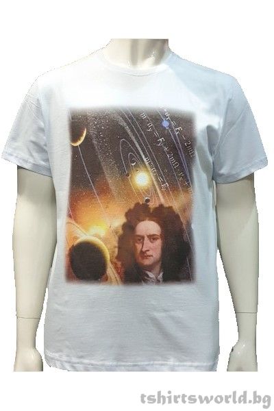 Mъжка тениска в бял цвят с дигитален печат на английски физик, математик, астроном, философ, алхимик и богослов Исак Нютон. Тениската е изработена в България под марката PRINTEX от висококачествен 100% пениран памук на 170 гр./м², който запазва цялостта на материята и наситеността на цветовете дълго време. С удобна кройка, тениската е свободна и позволява максимален комфорт при носене. Професионално изработен висококачествен дигитален печат, устойчив на пране с години. Тениската може да се пере при температура до 40 градуса. Спокойно можем да гарантираме за качеството на изработката и ярките цветове на дизайна.